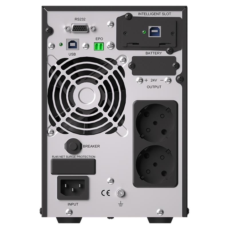 - Açıklama: Yüksek güç yoğunluğu Tam dijital kontrol ile online çift çevrim Geniş giriş gerilim aralığı: 110~300 VAC PFC ile 0,99 giriş güç faktörü Seçilebilir çıkış voltajı: 208/220/230/240 VAC Optimize edilmiş akü performansı için akıllı şarj cihazı tasarımı Maksimum şarj akımı 12A’ya kadar genişletilebilir (Uzun çalışma ünitesi) Acil güç kapatma fonksiyonu (EPO) Enerji tasarrufu için ECO mod çalışması Jeneratör uyumlu Cold start Akıllı fan hızı ayarı Yük segmenti ayarlanabilir (Opsiyonel) Çok yönlü LCD insan-bilgisayar arayüzü Çoklu iletişim arayüzü: RS232 (USB/EPO/ Kuru kontak kartı/SNMP kartı opsiyonel) Çoklu koruma fonksiyonu: kısa devre, aşırı yük, aşırı ısınma, akü aşırı şarj ve aşırı deşarj, çıkış düşük gerilimi ve fan arıza alarmı